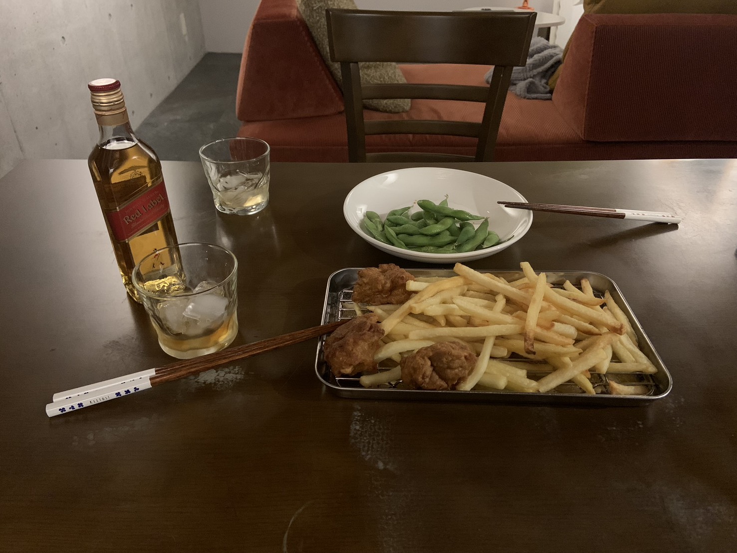 夜中に妻と二人でポテトと唐揚げを食べてしまいました。